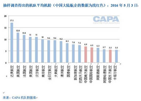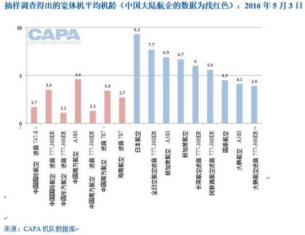 中国南方航空已淘汰了波音777-200ER机型,中国国际航空则正在逐步淘汰波音747-400机型,且其之前已淘汰了A340与波音767。因此,中国航企的宽体机机龄较短,比亚洲同行以及阿联酋航空等超级航企的宽体机机龄都更短。下表未将A330机型包括在内,因为此机型同时在国内航线、国际近程航线、国际远程航线上使用。