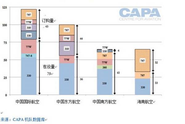 中国航企目前在不断接收宽体机,中国四大主要航企中国国际航空、中国东方航空、中国南方航空与海南航空,将于2016年接收22架宽体机,于2017年接收18架,于2018年再接收37架。这些是官方已公布的数量,不包括即将达成的交易量(例如中国东方航空还将订购10架波音777-300ER)以及最后一刻出现在订货单上的量。同时也不包括北京首都航空、西藏航空与厦门航空等航企不断增长的宽体机数量。中国国际航空与中国东方航空的宽体机订购量已达到其宽体机在役量的50%到80%。海南航空宽体机订购量也几乎与在役量持平。中国南方航空仅有4架的订购量。东方航空已订购了15架波音787-9与20架A350-900。