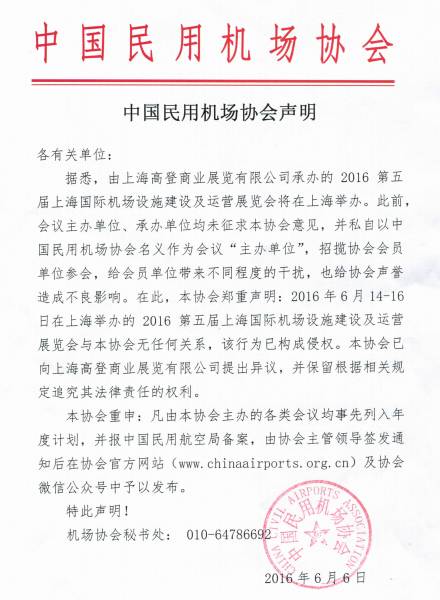 据悉,由上海高登商业展览有限公司承办的2016第五届上海国际机场设施建设及运营展览会将在上海举办。此前,会议主办单位、承办单位均未征求本协会意见,并私自以中国民用机场协会名义作为会议“主办单位”,招揽协会会员单位参会,给会员单位带来不同程度的干扰,也给协会声誉造成不良影响。在此,本协会郑重声明:2016年6月14-16日在上海举办的2016第五届上海国际机场设施建设及运营展览会与本协会无任何关系,该行为已构成侵权。本协会已向上海高登商业展览有限公司提出异议,并保留根据相关规定追究其法律责任的权利。