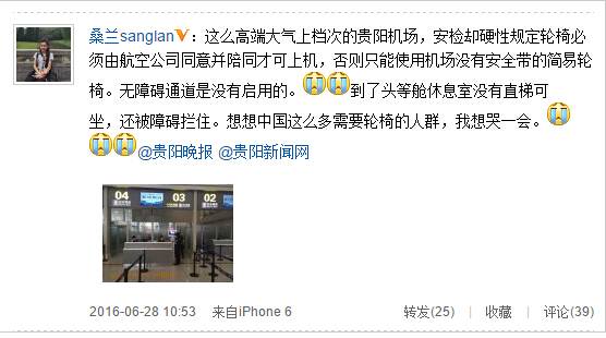 桑兰在微博中写道:“这么高端大气上档次的贵阳机场,安检却硬性规定轮椅必须由航空公司同意并陪同才可上机,否则只能使用机场没有安全带的简易轮椅。无障碍通道是没有启用的。[泪][泪]到了头等舱休息室没有直梯可坐,还被障碍拦住。想想中国这么多需要轮椅的人群,我想哭一会。[泪][泪][泪]@贵阳晚报 @贵阳新闻网 @贵阳机场微博”