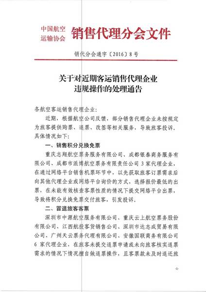 重庆志翔航空票务服务有限公司、成都银泰商务服务有限公司、成都市派博航空票务有限责任公司3家机票代理企业, 在通过网络平台销售机票环节中,以先获取旅客订票需求后向其他代理企业或网络平台询价的方式,选择报价最低的出票,在未能有效核查客票性质的情况下提交网络平台出票, 导致将积分兑换免票交付旅客,引发投诉。