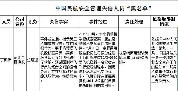 民航局相关负责人表示,此次公布的行业“黑名单”是我国民航安全管理信用体系建设历程中一个重要的里程碑,旨在严格执行安全生产法,有效惩戒民航生产经营单位及管理人员在安全管理过程中存在的失信行为。此次被列入“黑名单”的人员和单位,均为近年来发生重大生产安全事故和严重失信行为的生产经营单位和企业主要负责人。