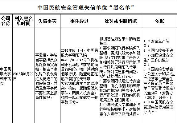中国民用航空网讯:8月10日,民航局官网首次公布了《中国民航安全管理失信人员“黑名单”》和《民航安全管理失信单位“黑名单”》,丁邦昕、李强、朱南、张沛4人终身不得担任民航生产经营单位的主要负责人;中国民航大学朝阳飞院给予停飞整顿,行政处罚2.9万元等惩戒。