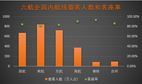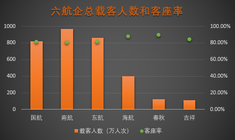 可以看出,南航仍是六家航企中载客人数最多的,东航和国航紧随其后。而客座率方面,则是春秋航空最高,为89.16%,南航最低,为80.83%。