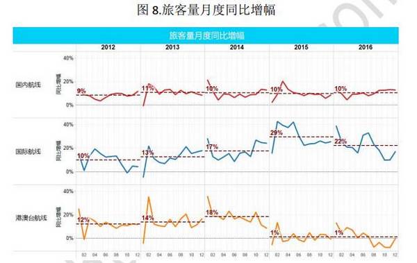 - 国际航线的平均增幅则在2015年冲至29%。2016年火热,1月同比增幅达到39%,但后力不足,全年平均月度增幅放缓至22%,较前一年下降了7个百分点,增速放缓。