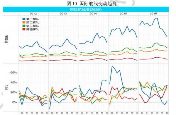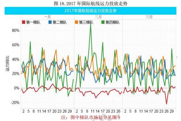 - 近年来,随着出行目的地的多元分散化逐渐显现,第四梯队的运力投放也在逐年小幅上涨,2017年第一季度运力同比增幅为23%,超出2016年同期近13个百分点。