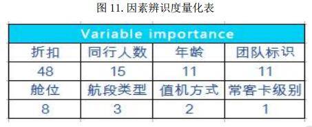 - 参见图11,发现折扣、同行旅客人数、年龄、团散标识四大因素依次为选择直销或分销渠道辨识度最高的主要因素,将各因素对于渠道选择的辨识度量化为一个总量为100的数值,上述四大因素则已达到辨识度的85%。