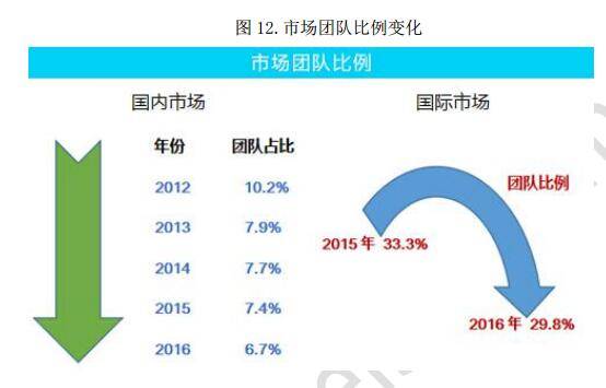 - 国内市场旅客规模连年扩大,旅游需求逐年递增,然而团队比例却出现连续4年下降的现象,如图12所示,与2012年相比国内市场的团队份额下降了近4个百分点。