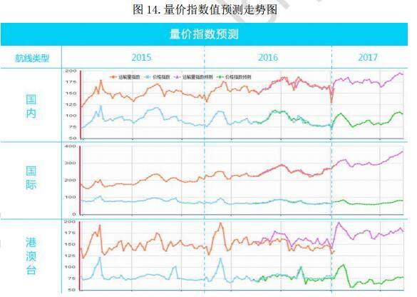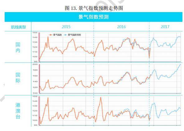- 2017年前7个月三类航线价格指数将持续下降,国际航线价格指数降速放缓,指数预测值将徘徊在60左右;国内航线价格指数变动范围较大,平均预测值为88;港澳台航线春运过后价格指数降幅略大,预计将维持在76以下。