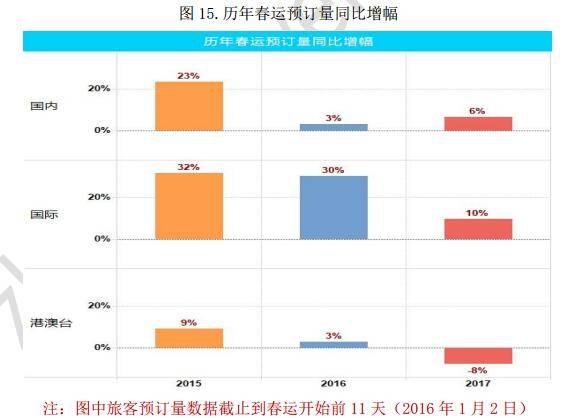 - 目前来看,国际航线2017年春运预订量增速仅10%,仅为前两年同期的1/3。这与2016年四季度以来的国际市场下滑态势相映照。“出境过大年”的热潮将在2017年春运出现“退热”。