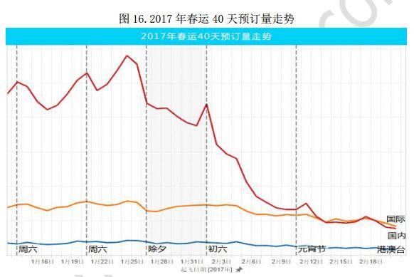 - 如图16所示:由目前的预订数据看在春运40天中国内航线除夕两天达到峰值,此外节前两天及春节假期最后一天初六均出现大规模集中出行。