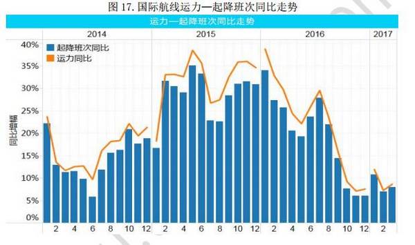- 由图17所示:2016年至2017年第一季度出入境市场的运力同比增幅呈现“三级跳水”走势,各航司逐步收缩国际航线的市场投放,起降班次、运力同步走低。