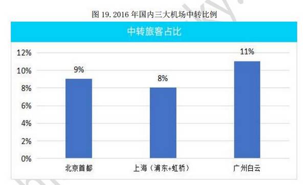 目前我国民航运输市场的枢纽能力与国际大型枢纽机场相比中转水平还相差甚远。如图19所示,2016年国内三大枢纽机场中转旅客占比均不足10%,而国际中转枢纽水平较高的亚特兰大机场、匹兹堡机场、休斯顿机场等中转量占比都超60%。