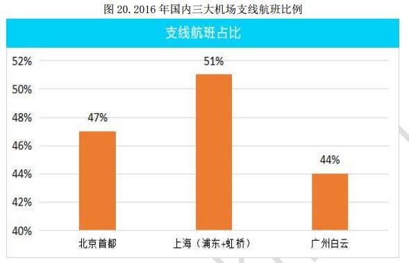 - 由图20所示,目前国内三大机场起降支线航班占比偏高,国内非省会城市与北上广互飞的支线航班占据三大机场航班量的半数左右,成为大型枢纽机场向中转枢纽机场方向发展的制约因素。