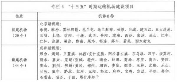 在《规划》“十三五”时期运输机场建设项目的表格中,北京新机场等续建机场项目有30个;成都新机场、平凉、湘西、邢台等新建机场项目44个;广州、浦东、虹桥、深圳、成都等城市的改扩建机场项目达到139个。