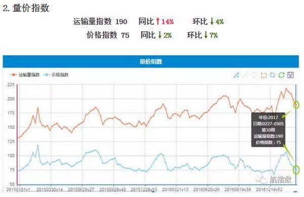 国内市场运输量指数176,环比下降5%;价格指数81,环比下降8%。