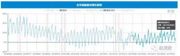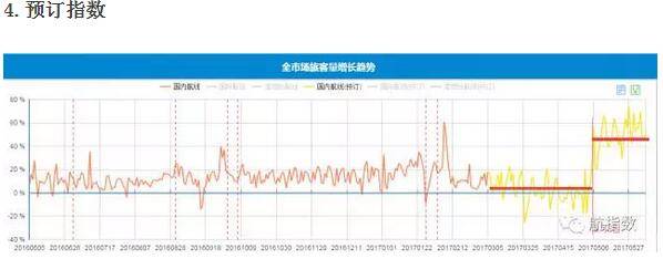 目前国内航线旅客预订量增幅趋势处于低位震荡状态。预计将会在5月3日左右出现新一轮的高速增长期,其平均同比增幅可达40%以上。