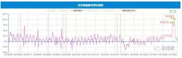 目前港澳台航线预订量在0点上下震荡前行,图中可以看出在5月27日和30日将出现两个增长高峰,其同比增长分别85%和104%