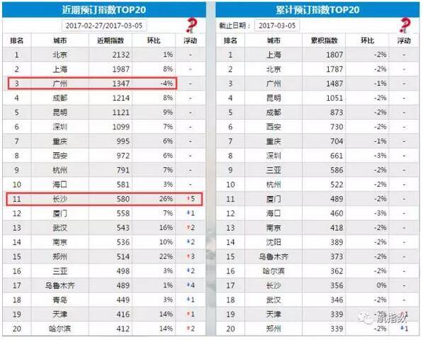 本周近期预订指数TOP20城市中,除广州出现环比下降外其余各城市均出现了不同程度的上升。其中长沙环比升幅最大达26%,同时排名上升了5个位次,目前位列第11名;另外本周排在10名以后的城市其排名均出现了明显变化。