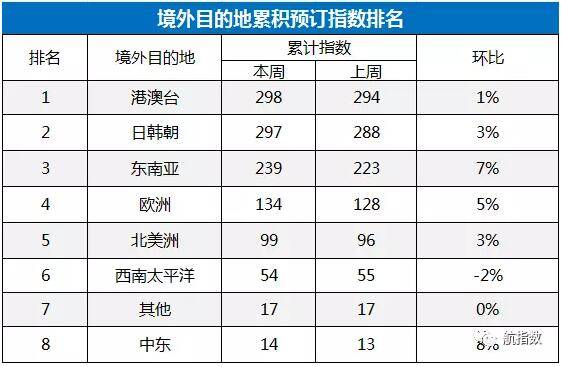 本周境外目的地累计预订指数中中东地区环比增长8%,增速领跑其余地区。