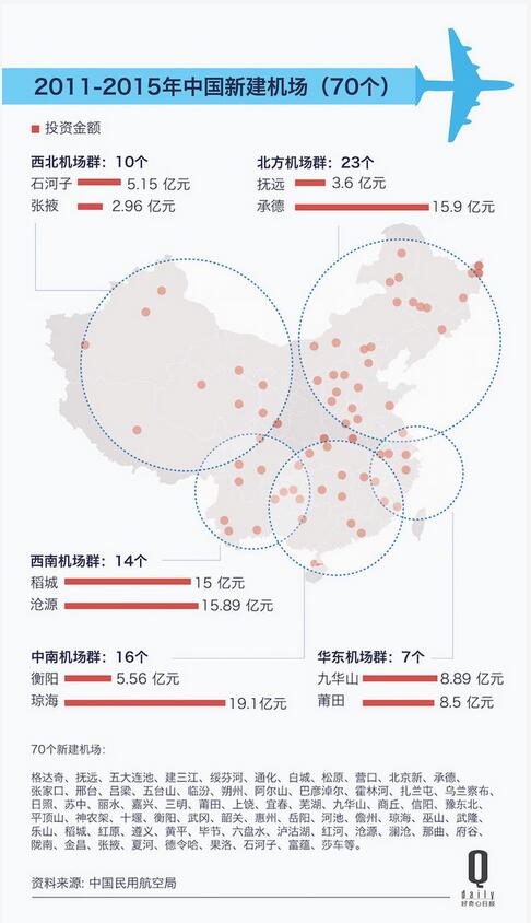从 2011 年到 2015 年,中国新建机场总数就有 70 个,大部分都是地区性机场,分布在北方、华东、中南、西南和西北,耗资金额少则几亿,多达几十亿。