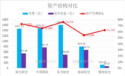 •海南航空通过股权融资扩大规模,净资产已经超过南航和国航,而且负债率降到54%。