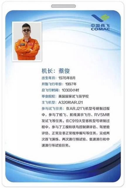 目前计划执行C919首飞任务的机长蔡俊就是如此。6年前,蔡俊还是东方航空的一名飞行员,而现在,他是中国商飞试飞中心试飞员二中队的中队长,现总飞行时间为10300小时。