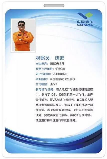 而担任首飞观察员的钱进,具有30多年飞行经验丰富,民航功勋飞行员,驾驶过空客A340、波音767、波音777,目前任职中国商飞公司总飞行师、民用飞机试飞中心主任。