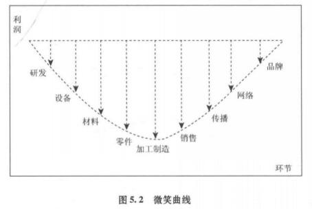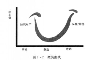 微笑嘴形呈一条曲线,两端朝上,在产业链中,附加值更多体现在两端——研发和营销,处于中间环节的制造附加值最低。