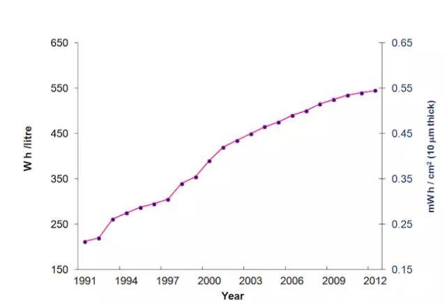 同时,锂电池的技术进步也很缓慢。随着手机、电脑、电动汽车的应用,这 20 年来,工业用锂电池得到了不小的改进。但从 1991 年到 2011 年,锂电池的能量密度提升了一倍,达到了大约 200-300 瓦时每千克的水平,同时,这种改进带来的增长曲线正在变慢。