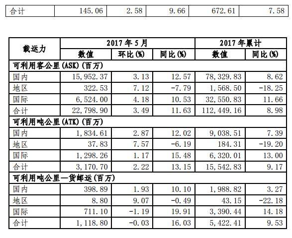 货运方面,2017年5月货运运力投入(按可利用吨公里—货邮运计)同比上升16.03%,货邮周转量(按收入吨公里—货邮运计)同比上升23.44%;货邮载运率为55.98%,同比上升3.36个百分点。 2017年5月,本集团引进1架A321、2架B737-800,退租1架B737-800。