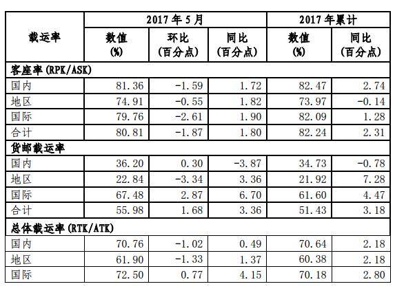 2017年5月,中国南方航空股份有限公司及所属子公司(以下简称“本集团”)客运运力投入(按可利用客公里计)同比上升11.63%,其中国内同比上升12.57%,地区同比下降7.79%,国际同比上升10.53%;旅客周转量(按收入客公里计)同比上升14.17%,其中国内同比上升15.00%,地区同比下降5.50%,国际同比上升13.23%;客座率为80.81%,同比上升1.80个百分点,其中国内、地区、国际分别同比上升1.72、1.82、1.90个百分点。2017年5月20日起,本集团新增福州-暹粒-福州航线(每周两班),2017年5月26日起,本集团新增武汉-济南-武汉航线(每周三班)。