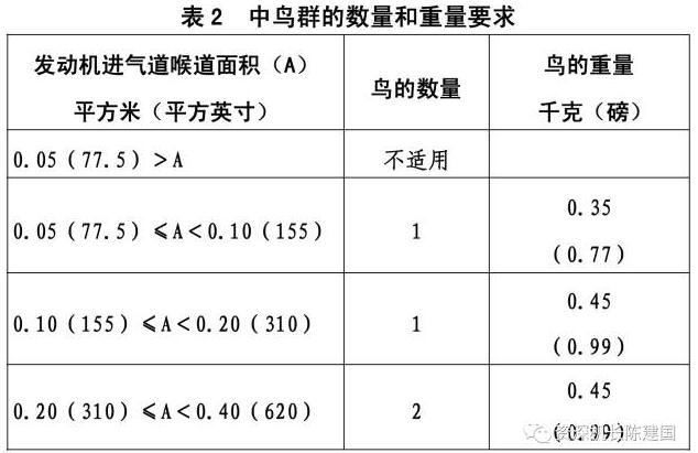 (2)应进行吸中鸟的发动机试验以便模拟遭遇鸟群,表2中规定了使用鸟的数量和重量。当规定只用1只鸟时,这只鸟应投在发动机核心机流通道上;必要时,应通过合适的试验或分析或两者的组合来确定发动机前迎风表面上的其他关键位置。在表 2中规定使用2只或2只以上的鸟时,其中最大的1只鸟应投向发动机核心机流通道上,而次重的1只鸟应投向第一级转子叶片的最关键的暴露位置上,其余的鸟必须均匀地分布在整个发动机的前表面上。