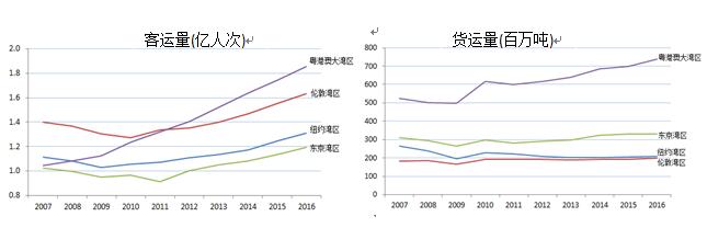 图 2007-2016年各大湾区航空客货吞吐量对比(亿人次,百万吨)