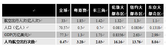 粤港澳湾区虽然航空客货总量大,但与伦敦、东京、纽约等世界级湾区相比,人均航空出行次数依然较低,仅为纽约湾区的1/4,伦敦湾区的1/5,依然有较大的提升空间。