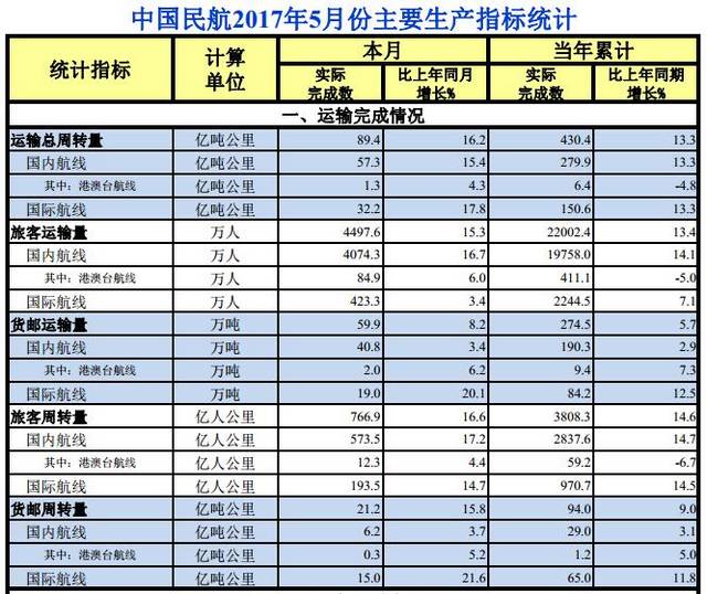 截至2017年5月31日,中国民航累计完成旅客运输量22002.4万人次,同比增长13.4%,货邮运输量274.5万吨,同比增长5.7%.