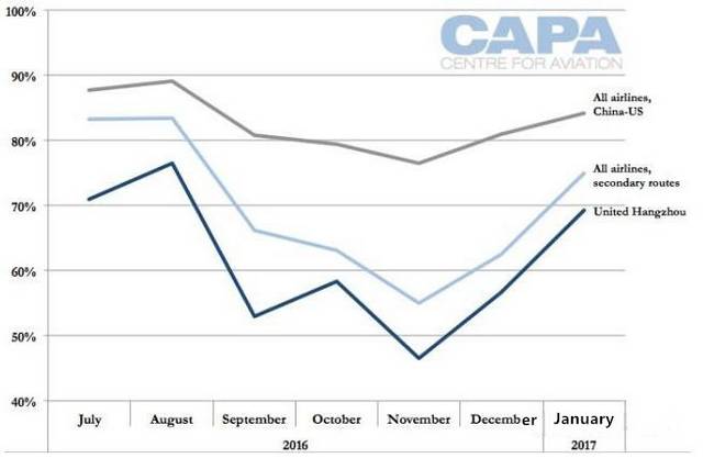 但是,从2016年7月开航到2017年1月,杭州航线的平均客座率仅有61%,远远低于同时期美联航在中国81%的平均客座率,并且将近17个小时的过站时间,使得美联航新的波音787飞机在杭州航线的利用率也非常低,这也推高了运营该航线的成本。