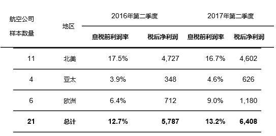 国际航协针对21家航空公司的抽样调查显示,2017年第二季度航空公司息税前净利润与2016年第二季度水平(12.7%)相比实现增长,达到13.2%。其中参与调查的4家亚太航空公司2017年第二季度税后净利润为6.26亿美元,息税前利润率为4.6%;参与调查的6家欧洲航空公司2017年第二季度税后净利润为11.8亿美元,息税前利润率为9.0%;参与调查的11家北美航空公司2017年第二季度税后净利润为46.02亿美元,息税前利润率为16.7%。