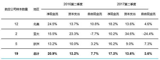 国际航协调查显示,19家航空公司的自由现金流占比在2017年第二季度降至3.6%,低于2016年第一季度7.7%的水平。