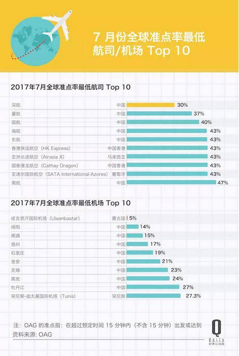 根据英国航空信息公司OAG7月份的准点率报告,排名垫底的基本上都是国内航司和机场,最差的深航准点率不到三成。其中也包括最重要的几家航司,国航、东航、南航和海航。