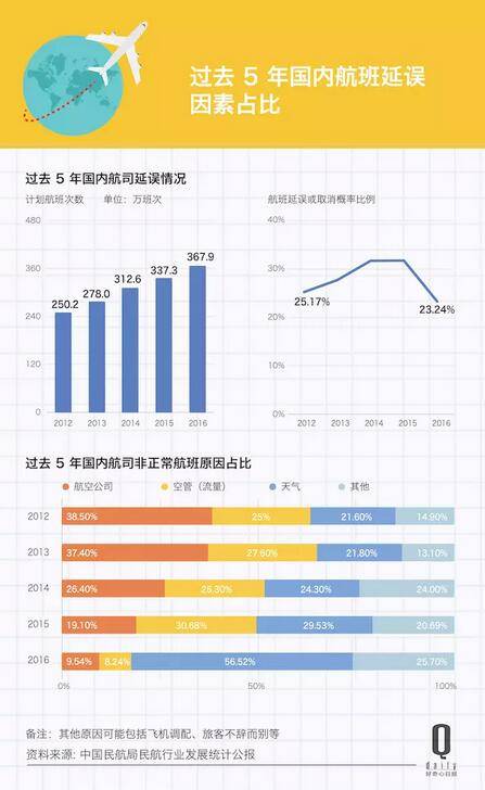 这代表着航空管制的一个部分。但在过去5年,影响航班延误甚至取消的原因在发生变化。过去,最大的原因来自于航空公司本身,因为机组休息不够、航班调配等原因导致航班没能准点。但这部分因素逐渐被更严重的天气、以及仍然比较复杂的航空管制所替代。