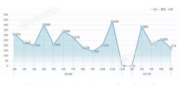 而在2016和2017年,恶劣天气影响航班的时长数据其实差不多。以下是从2016年至今,恶劣天气每个月影响机场的时间长度,今年2月到5月,恶劣天气的影响时间并没有大幅增加: