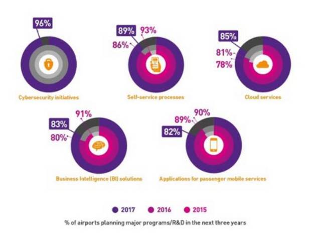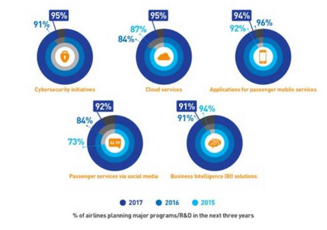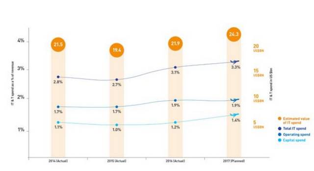 中国民用航空网讯:全球航空运输业领先的IT商务解决方案和通讯服务提供商国际航空电讯集团(SITA)发布《SITA 2017航空运输业IT趋势调查》,预计今年航空公司和机场在IT领域的支出将达近330亿美元。针对技术领域的投资同样重要,网络安全和云服务投资位列航空公司和机场CIO关注的首位。此外,旅客自助服务投资也是优先投资的重点。
