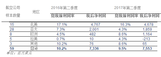 国际航协针对59家航空公司的抽样调查显示,2017年第二季度航空公司息税前净利润与2016年第二季度水平(10.2%)相比出现下降,降至9.5%。其中参与调查的28家亚太航空公司2017年第二季度税后净利润为18.59亿美元,息税前利润率为4.3%;参与调查的8家欧洲航空公司2017年第二季度税后净利润为11.64亿美元,息税前利润率为8.6%;参与调查的15家北美航空公司2017年第二季度税后净利润为46.78亿美元,息税前利润率为16.3%。