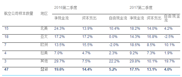 国际航协调查显示,47家航空公司的自由现金流占比在2017年第二季度降至4.0%,低于2016年同期(5.2%)水平。