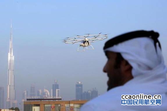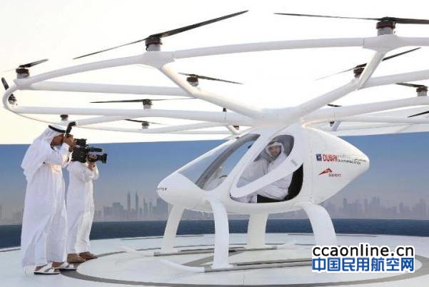 测试所使用的载客无人机由德国无人机公司Volocopter研发。它看上去就像一架头上顶着18个螺旋桨的小型直升机。