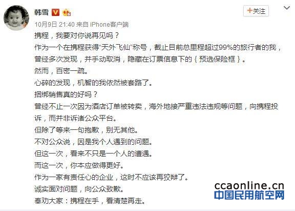 韩雪在微博称,作为携程的资深用户,自己曾经多次发现并手动取消隐藏在订票信息下的{预选保险框},但仍旧百密一疏被套路。她表示,曾经不止一次因为酒店订单被转卖,海外地接严重违法违规等问题,向携程投诉,而并非诉诸公众平台。但除了等来一句抱歉,别无其他。她要求携程诚实面对问题,向公众致歉。”奉劝大家:携程在手,看清楚再走。“
