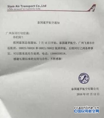 泰国暹罗航空从2015年4月开始开通曼谷==广州航线,每日执行一个班次,进港航班O8821清晨4:50抵达广州,同日05:50出港航班O8822飞返曼谷廊曼国际机场。航班由波音737-300型飞机执飞,在2016年7月13日暹罗航空突然宣布,广州、深圳、香港的个别航班停飞,由于停飞,当时有超过800名旅客滞留在泰国。有当地媒体指,暹罗航空由于债务问题,资金链断裂,面临破产。