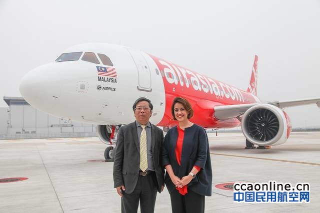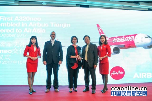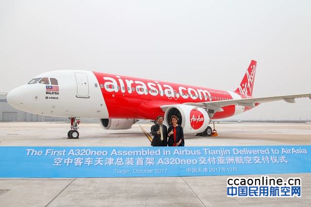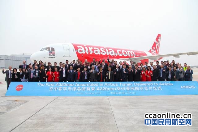 中国民用航空网讯:空中客车公司今日在中国天津举行仪式,向马来西亚亚洲航空交付了由空客亚洲总装线完成总装的首架A320neo飞机。该飞机装备了CFM国际公司的LEAP-1A发动机,采用了创新的舒适空间客舱布局,共可容纳186名乘客。