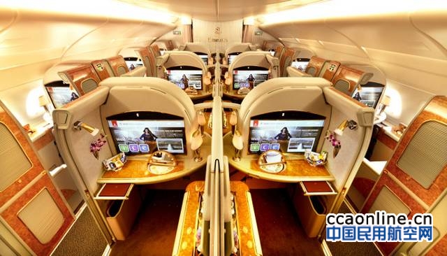 2008年阿联酋航空首架A380投入使用,为客户体验设立了新的标准,引入了行业内的许多第一:机上酒廊、淋浴间、免费无线网络、所有舱位使用先进的机上娱乐系统,还有许多其他功能。